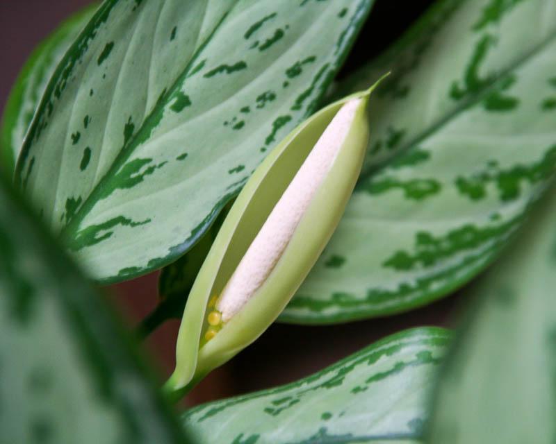 Соцветия аглаонемы имеют бледно-зеленый оттенок и формируются в виде початка длиной около 3 см. Они возникают в 1-3 пазухах верхних листьев.