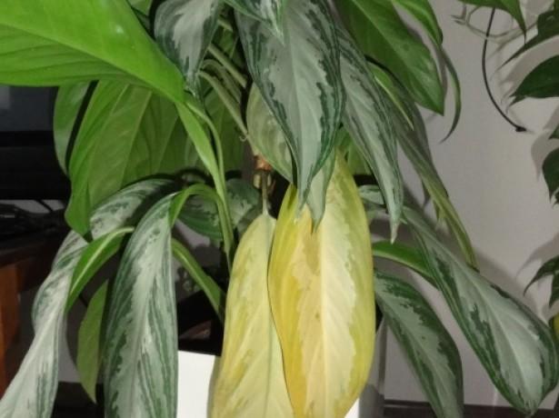 Листья аглаонемы имеют ланцетную форму и длину от 10 до 15 см. Они могут быть как зелеными, так и украшенными разноцветными разводами, при этом средние прожилки хорошо выражены. Растения с зелеными листьями прекрасно адаптируются к условиям с низким уровнем освещения, в то время как аглаонемы с пестрой листвой требуют более яркого света для нормального роста. Цветоводы советуют избегать использования спреев для придания блеска листьям, так как это может негативно сказаться на растении.