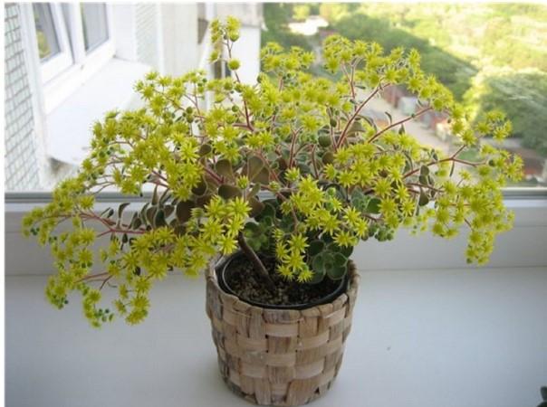При правильном уходе за кустарником можно наслаждаться яркими желтыми цветами у себя дома. Цветущий аихризон на подоконнике будет радовать всех, кто проходит мимо окна.