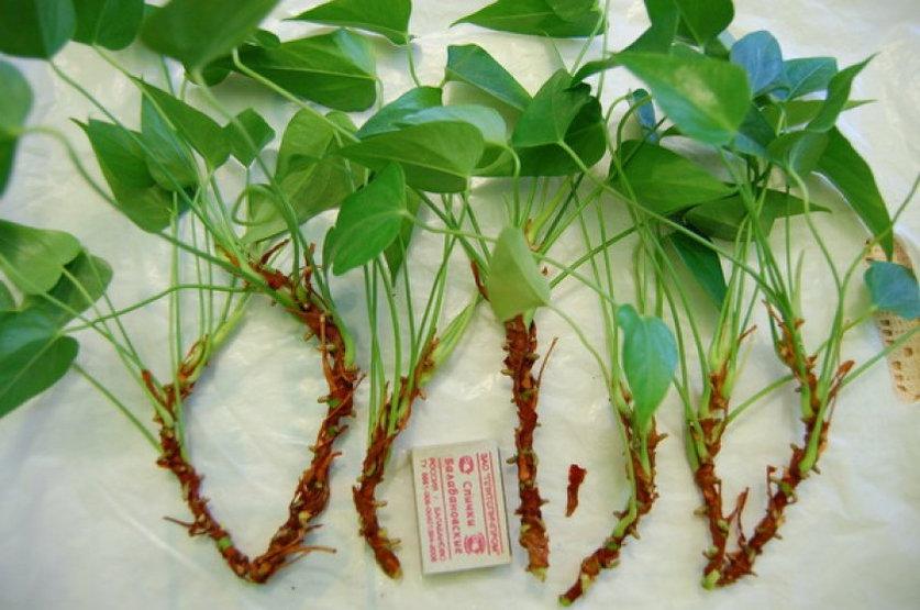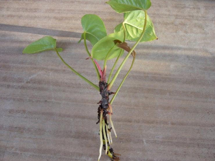 Важно! Корни антуриума очень хрупкие и легко повреждаются, что может привести к их полному уничтожению. Никогда не пытайтесь вытащить отросток с корнями – это может привести к отрыву корневища, и вам придется долго укоренять молодые побеги без корней. В таком случае растение будет приживаться медленно и с трудом.