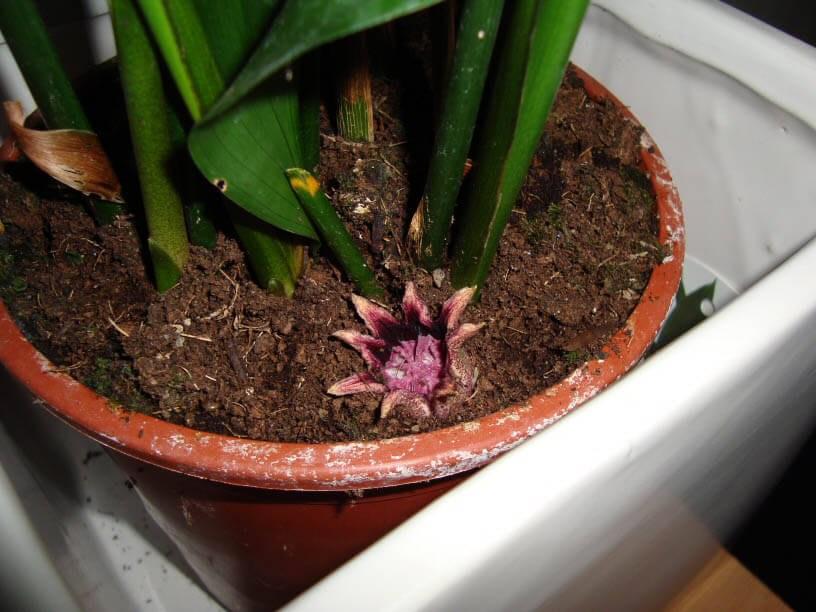 Бутоны у аспидистры образуются на корнях и выглядят поистине уникально: маленькие, розовато-фиолетовые соцветия с бурым оттенком, напоминающие звезду. Цветок распускается всего на один день, после чего образуется плод с семенами.