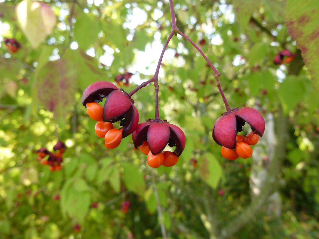 | Бересклет европейский (Euonymus europaeus) | Листопадный кустарник или небольшое дерево до 6 м высотой. Плоды ярко-розовые или красные, раскрывающиеся, обнажая оранжевые семена. | Хорошо растет на любых почвах, предпочитает солнечные места. Морозостоек. |