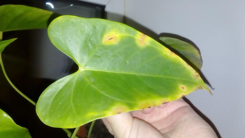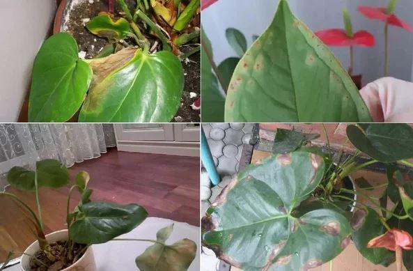 Желтые или коричневые пятна на листьях могут указывать на заболевания, требующие немедленного вмешательства. Переувлажнение почвы и низкие температуры могут привести к бактериальным и грибковым инфекциям у антуриума: