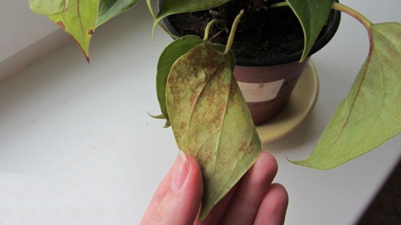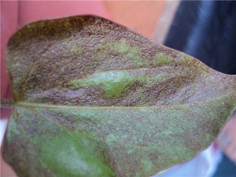 Если на верхней поверхности листьев появляются светлые пятна, а на нижней – коричневые пустулы, это может свидетельствовать о том, что антуриум поражен грибковой инфекцией, напоминающей ржавчину. На нижней стороне листьев споры развиваются стремительно, пятна могут объединяться, что приводит к пересыханию листьев. Для борьбы с этой болезнью рекомендуется применять фунгициды, такие как «Альбит», «Алирин» и «Фитоспорин».