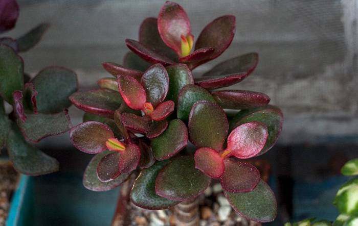 Если у толстянки начинают краснеть или приобретать фиолетовый цвет листья, стоит защитить растение от прямых солнечных лучей или переместить его в более затененное место.