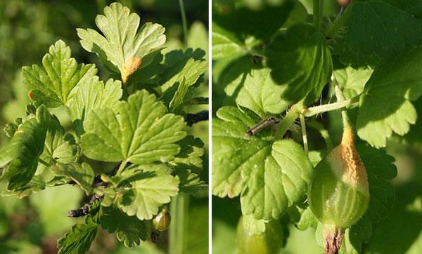 Это заболевание приводит к тому, что у крыжовника ягоды опадают, не успев созреть. Весной на верхней стороне листьев появляются желтые или светло-оранжевые пятна. На нижней стороне листьев формируются выпуклости, напоминающие бокал, внутри которых находятся споры грибка. При малейшем контакте споры разлетаются с ветром и могут поразить здоровые растения.