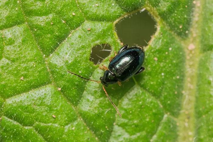 Взрослые жуки листоеды выедают отверстия в листьях мальвы, питаясь соком этого растения. Личинки способны уничтожить всю надземную часть мальвы. Когда садовод замечает поврежденные листья, возникает вопрос, чем обработать растение. Уксус эффективно отпугивает вредителей: 500 мл уксуса разводят в ведре воды и опрыскивают полученным раствором растения. Если количество паразитов значительно, рекомендуется использовать препарат Конфидор.