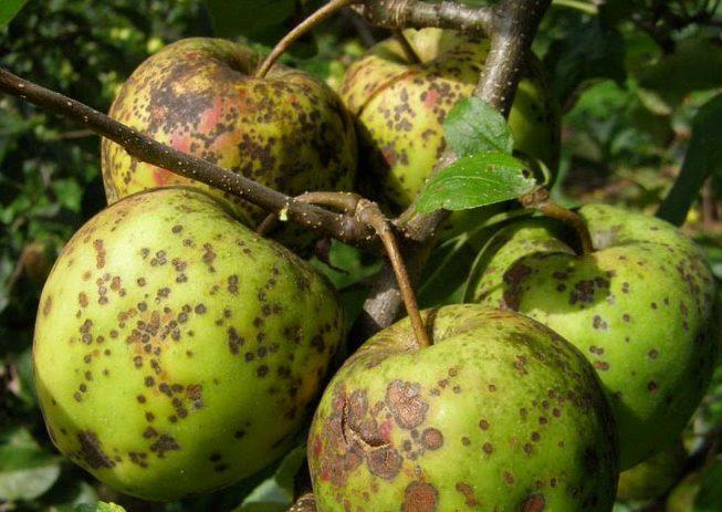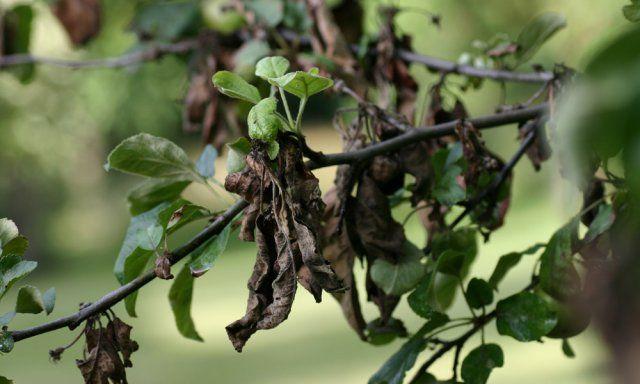 Наиболее распространенное и опасное грибковое заболевание, поражающее плодовые деревья, особенно яблони и груши. Инфекция проникает через почки и быстро распространяется по всей надземной части растения. Определить болезнь можно по зеленовато-коричневому налету, который появляется на листьях и затем переходит на плоды.