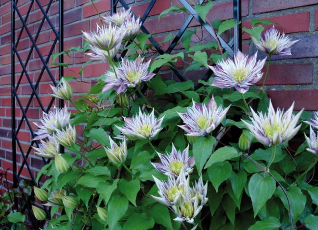 Клематисы, цветущие на протяжении всего лета, требуют значительной обрезки: старые нижние ветви оставляют на высоте до 50 см, а молодые стебли не должны превышать 20 см. Кустам, расположенным рядом с опорами, сохраняют стебли высотой до 10 см.