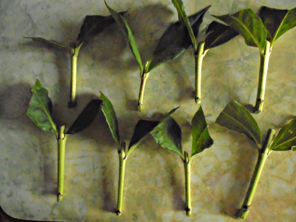 Затем стебли нарезают на части, каждая из которых должна содержать два узелка. После этого нижние листья удаляются полностью, а верхние обрезаются наполовину.