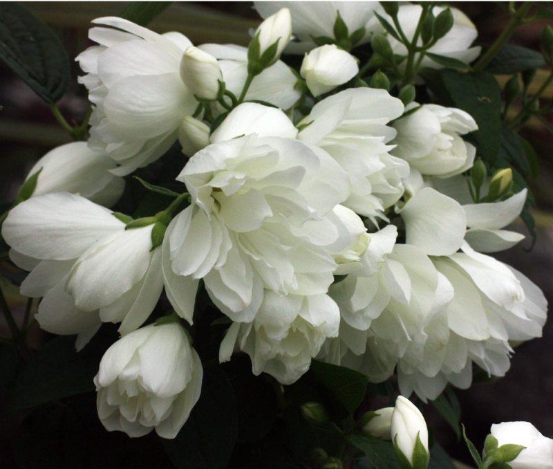 Цветение происходит с появлением махровых белых цветков, которые излучают нежный аромат, напоминающий запах жасмина. Бутоны диаметром 2-3 см образуются на побегах, выросших в прошлом году. Цветение начинается в мае и продолжается до середины июня.
