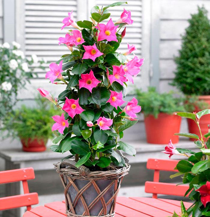 - дипладения ампельная. Это вьющиеся растения с быстрым ростом, обладающие глянцевыми овальными листьями. Ароматные цветы в форме воронки состоят из пяти лепестков, окрашенных в белый, розовый, малиновый или красный цвет. Взрослый куст может иметь до 80 цветков, которые могут сохраняться на растении более недели;