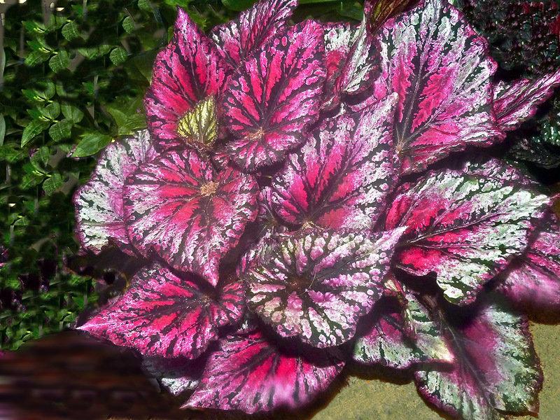 Королевская бегония. Этот листовой гибрид бегонии не предназначен для восхищения пышными цветами, а создан для того, чтобы радовать глаз своей необычной, пятнистой листвой на протяжении всего года. Листья имеют ассиметричную форму и могут достигать длины до 15 см. Их рисунок всегда яркий и представляет собой сложный узор, включающий зеленые, фиолетовые, серебристые и бордовые оттенки. Королевская бегония требует особого ухода и внимания;