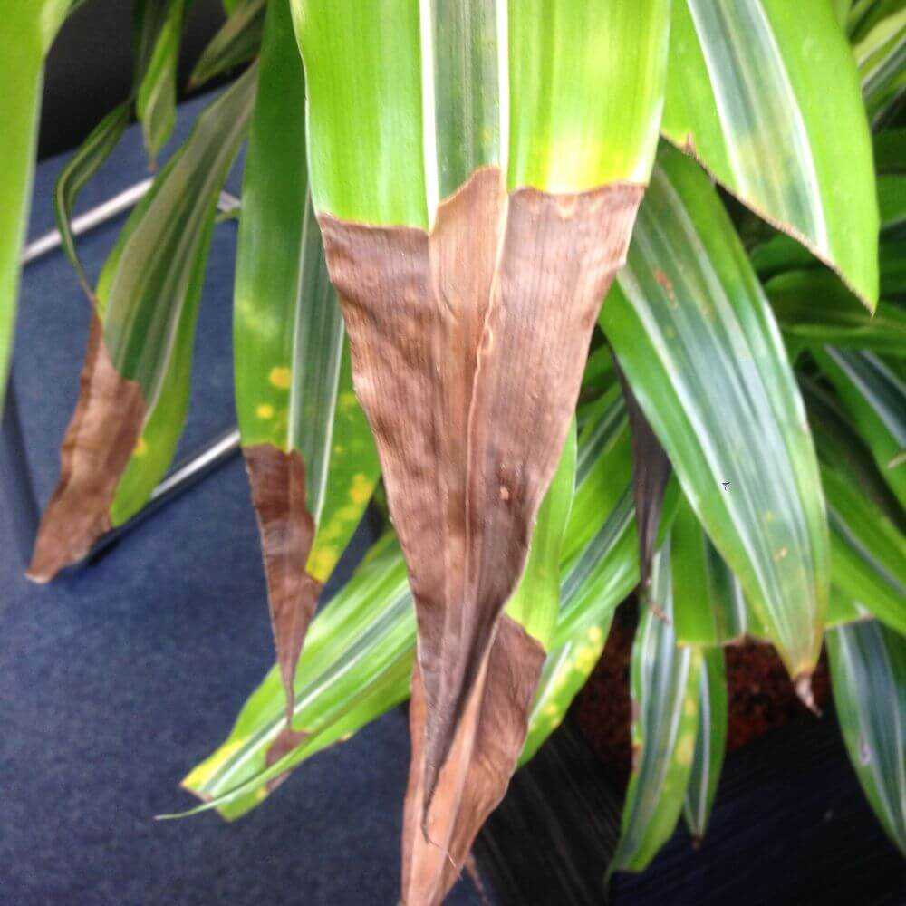 Это одна из самых распространенных проблем, с которыми сталкиваются владельцы драцены. Токсичное воздействие фтора проявляется в виде желтых кончиков и краев листьев, а также мертвых участков. Листья могут иметь темно-коричневые пятна с желтыми краями.