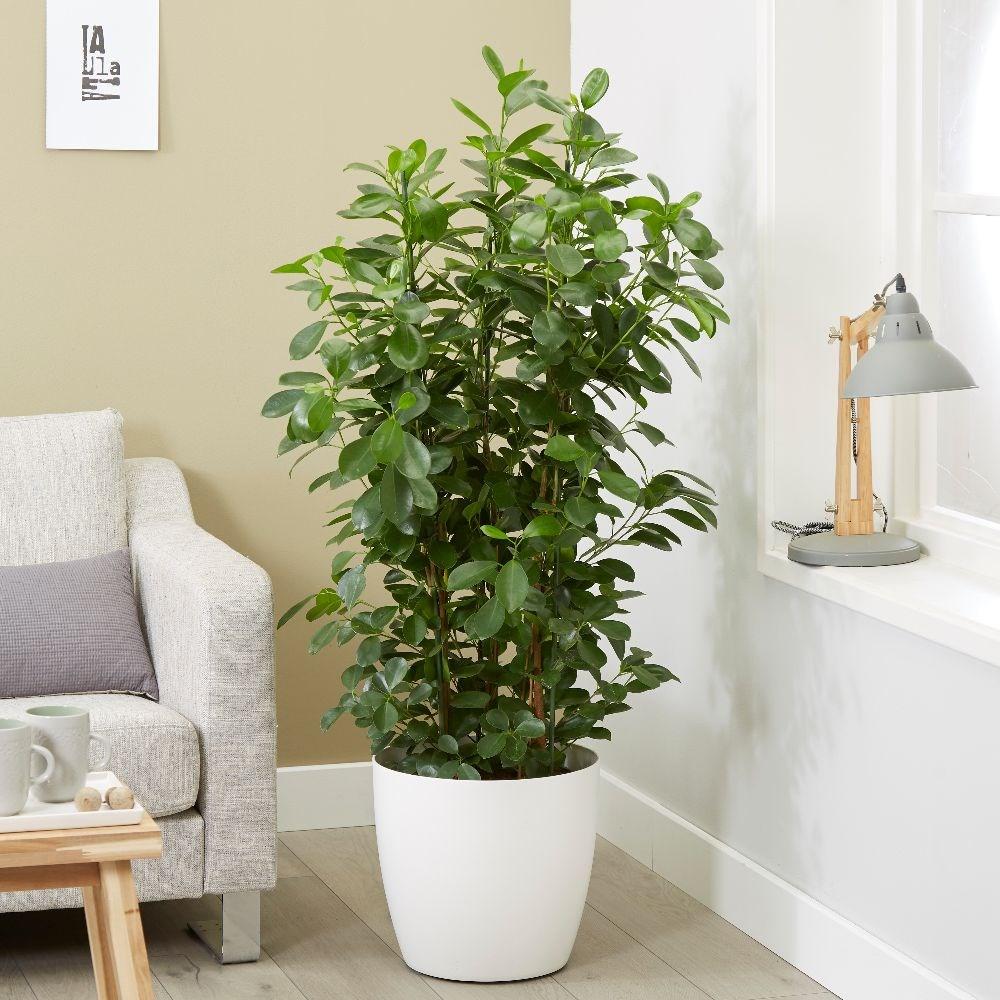Легкость в уходе: Фикус Мокламе считается одним из самых неприхотливых комнатных растений. Он хорошо адаптируется к различным условиям освещения, хотя предпочитает яркий рассеянный свет. Полив следует осуществлять умеренно, позволяя верхнему слою почвы подсохнуть между поливами, что делает его идеальным выбором для занятых людей.