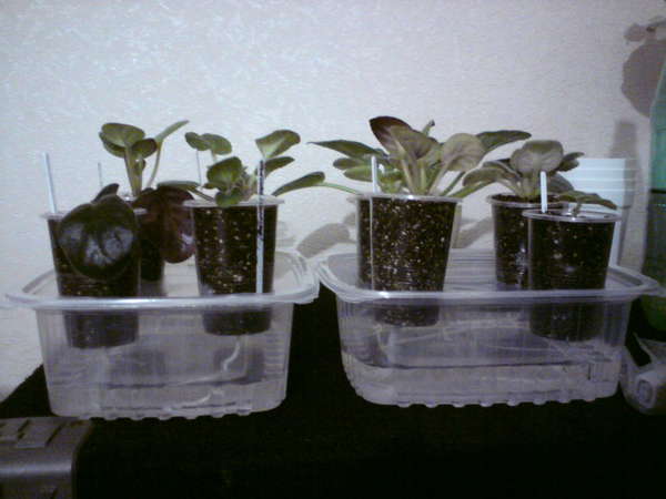 Фитильный полив существенно облегчает уход за фиалками, особенно при большой коллекции. Сложность состоит в том, чтобы подобрать оптимальный состав грунта и подготовить конструкцию для фитиля. Когда подготовительные работы сделаны, уход заключается в подливании воды в емкости примерно 2-3 раза в месяц.