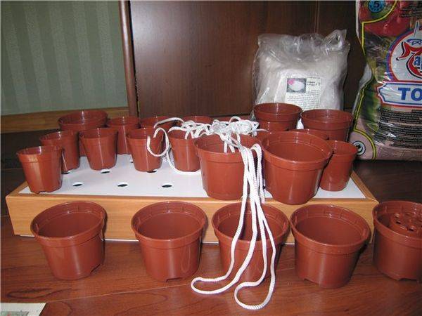 - Подготовьте фитиль. Для одного горшка потребуется отрезок длиной примерно 20 см, один конец которого укладывается спиралью на дно горшка, а другой помещается в емкость с водой.