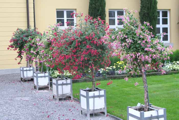 Фуксии не переносят, когда вокруг их корней слишком много пустого места. По этой причине их чаще всего можно встретить в горшках, чем без них. Эти растения можно культивировать не только в форме небольшого деревца, но и как роскошный куст в корзине или как каскад ярких веточек в подвесном кашпо.