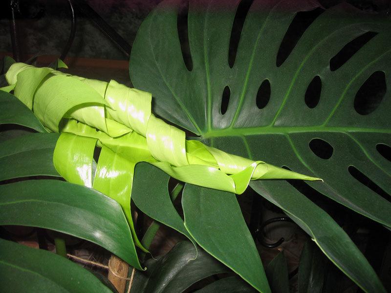 Монстера обладает большими резными листьями и крепкими стеблями.