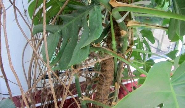 Воздушные корни формируются в узлах листьев напротив стеблей. Листья имеют насыщенный болотный зеленый цвет, блестящие, овальные или круглые, достигающие в диаметре до 50 см, и располагаются на длинных черешках длиной до 35 см. Молодые листья целые, а с возрастом на них появляются характерные прорези. В момент появления листья свернуты в трубочку и имеют светло-зеленый оттенок.