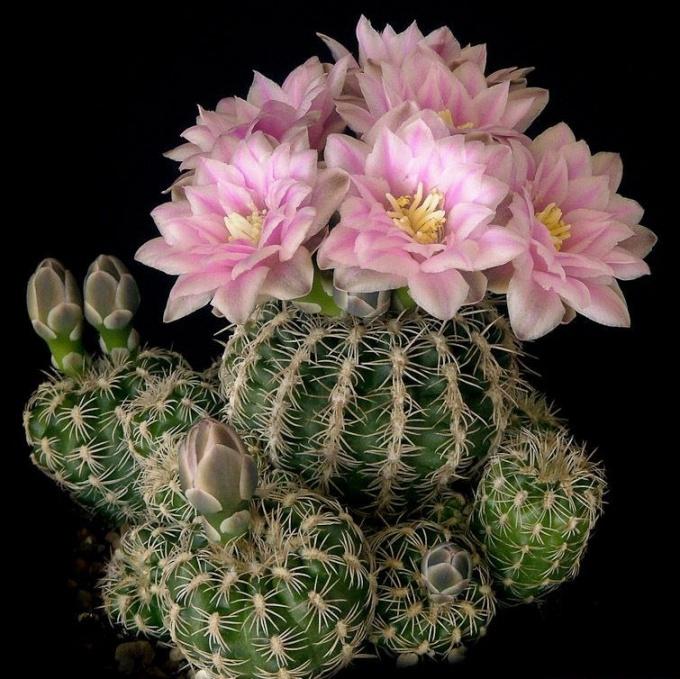 | Bruchii gymnocalycium | Для Бруха характерна ветвистость ствола. На округлом стебле высотой 6 см и диаметром 5 см появляются многочисленные мелкие отростки. Боковые колючки мягкие и светлые. У некоторых особей может вырасти и прямая центральная иголка. На каждом отростке распускаются нежно-розовые цветки с желтоватыми пыльниками. |