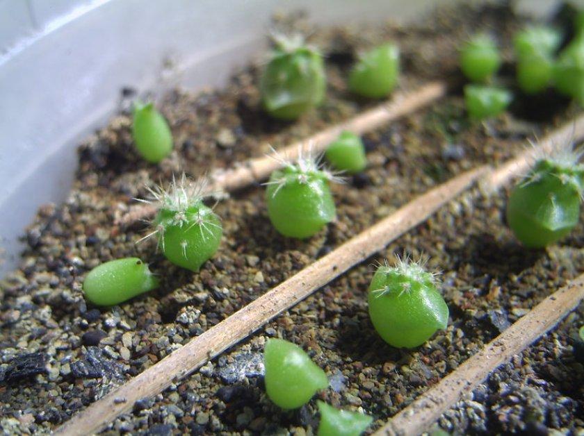 Сеять кактусы можно в любое время года. При должном уходе всходы появятся быстро и начнут активно расти. Спустя 12 месяцев их можно пересаживать в постоянные горшки.