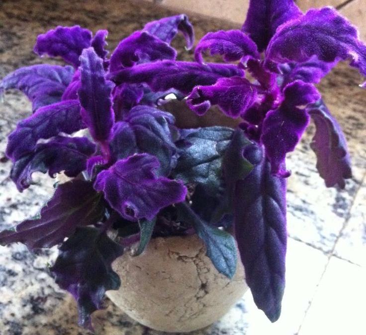 Эта разновидность выделяется среди других сортов благодаря яркому фиолетовому оттенку прожилок, обратной стороны листьев и их опушению. В сочетании с зелеными декоративными комнатными растениями она создает особенно привлекательный вид. Листья имеют вытянутую форму и могут достигать длины до 10 см, слегка закручиваясь. Молодой кустик растет вверх, однако со временем длинные побеги под собственным весом начинают наклоняться вниз.
