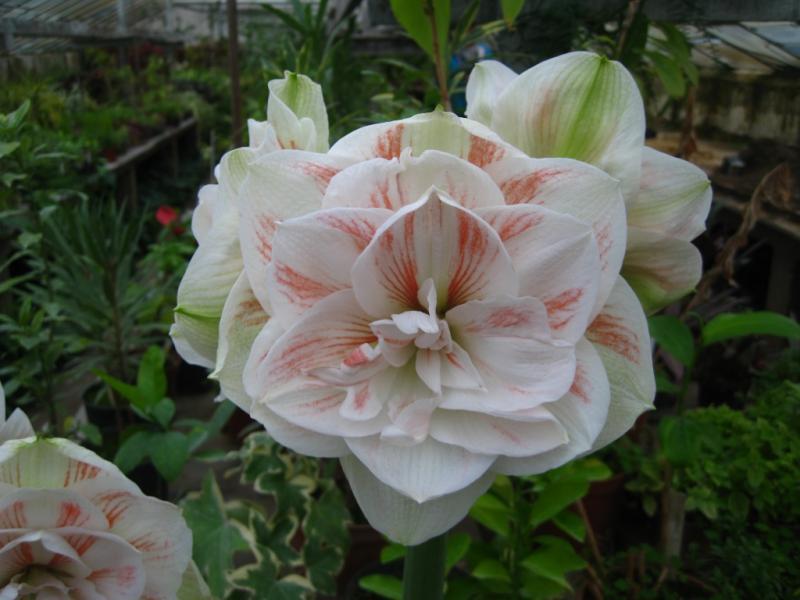 Этот гиппеаструм может иметь белый окрас с нежными, случайно расположенными розовыми полосками на махровых лепестках. Высота растения достигает 45 см, а диаметр цветка составляет 22-25 см.
