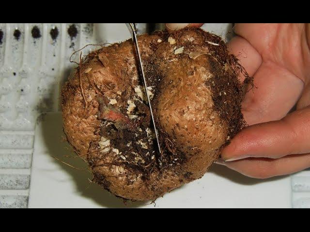 Насыпьте на дно горшка дренаж, заглубите клубень в землю на 1/3 — 1/2 высоты. Поливайте очень умеренно и осторожно по периметру горшка или в поддон, чтобы вода не попадала на клубень. Как только росток достигнет высоты 5 см, клубень можно засыпать полностью.