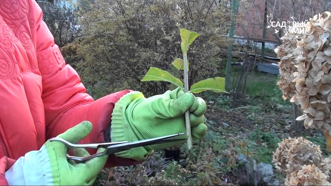 Черенки накрывают стеклянными банками и проветривают каждую неделю на протяжении 15 минут. В течение месяца они укореняются, после чего укрытие снимают. В регионах с мягким климатом отростки высаживают во влажный суглинистый грунт, а зимой их тщательно укрывают. В северных широтах укоренившуюся гортензию оставляют в прохладном помещении до следующей весны.