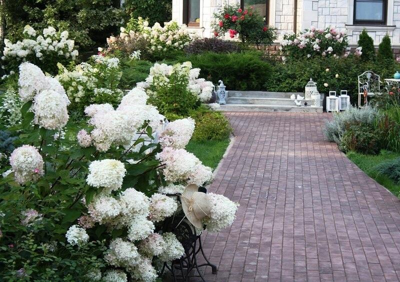 Крупнолистный вид (Hydrangea Paniculata) часто комбинируется с хвойными растениями, такими как туя, пихта или можжевельник. Для создания привлекательного сада гортензию Грандифлору Паникулату можно разместить рядом с плодовыми и ягодными кустарниками.
