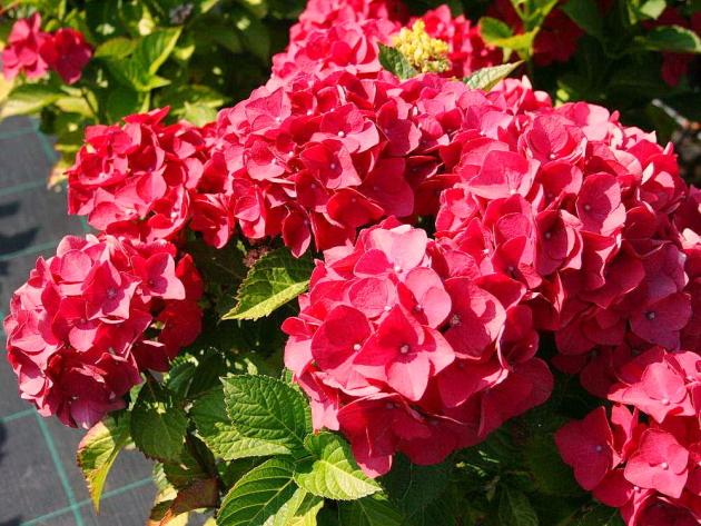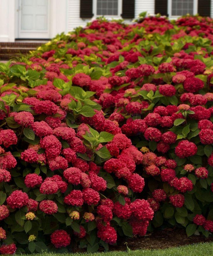 Это гортензия крупнолистная с огненно-красными цветами. Этот яркий сорт средних размеров прекрасно чувствует себя как на открытых участках сада, так и в домашних условиях, например, в больших горшках или кадках на солнечном балконе. Такое оформление будет радовать глаз на протяжении всего лета.