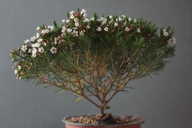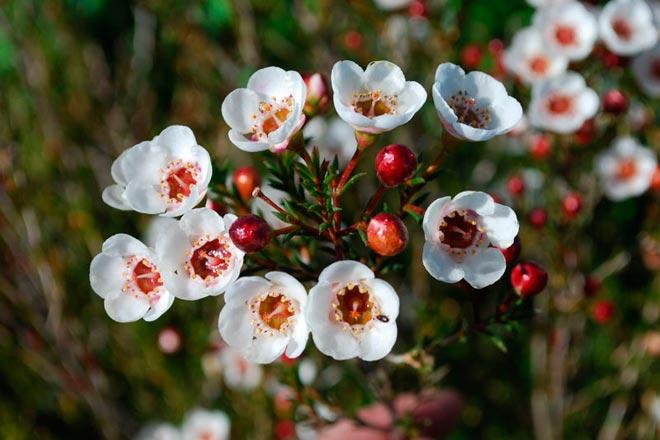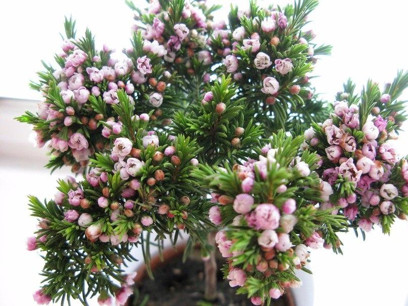 Когда хамелациум не цветет, его можно легко спутать с маленькой елочкой. Однако в период цветения его ветви украшают множество мелких, но ароматных цветов, которые могут быть белыми, красными, розовыми или фиолетовыми.