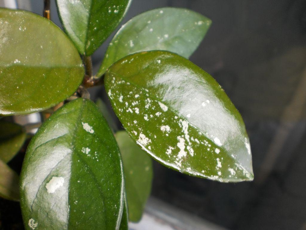 Другим опасным вредителем является мучнистый червец, который оставляет на листьях белый налет. Эти светлые насекомые легко заметны на растении и могут быть полностью устранены с помощью промывания цветка мыльным раствором.