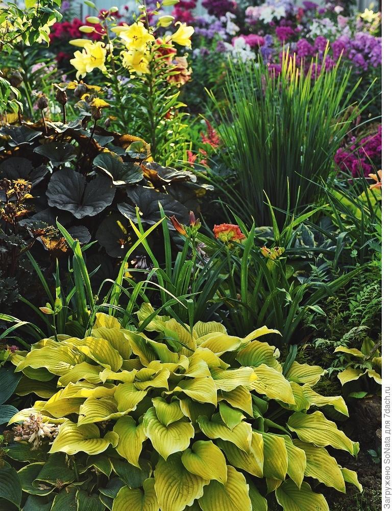 Эти привлекательные растения, растущие на клумбах, способны значительно повысить эстетическую ценность соседних цветов. Широкие листья хосты с оригинальным орнаментом смягчают и уравновешивают разнообразные растения, подчеркивая их красоту. Например: