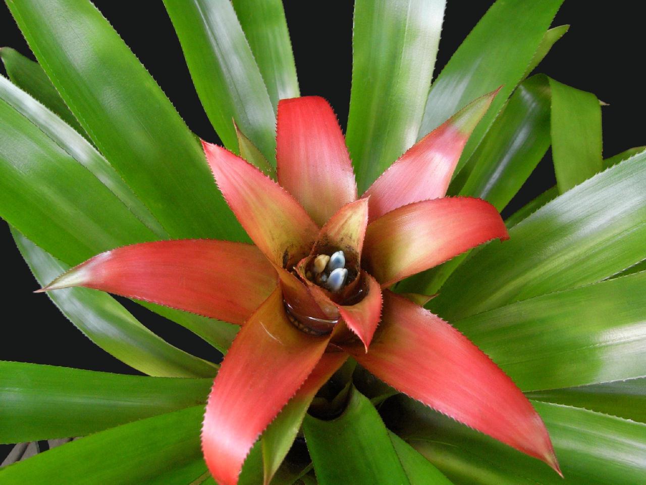 Домашнее растение, происходящее из тропиков, принадлежит к семейству Бромелиевых. Этот цветок примечателен тем, что у него отсутствует стебель. Острые зелёные листья вырастают прямо из основания. В период цветения на верхушке растения появляются красные листовые пластины.