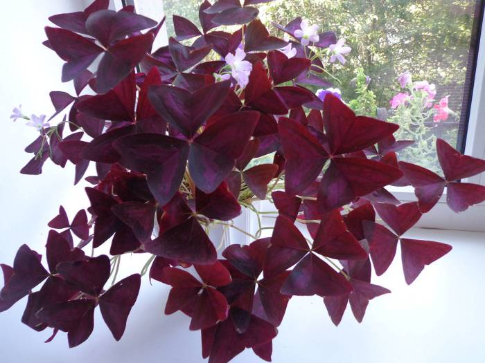 Это бесстебельное растение принадлежит к семейству Кисличных и в народе известно как заячья капуста. Его листья имеют резной вид, напоминающий клевер, и окрашены в красный цвет с фиолетовым оттенком. Днем листья поднимаются вверх, а с наступлением вечера начинают опускаться. Также его называют Мадам Баттерфляй из-за формы листьев, напоминающих бабочку.