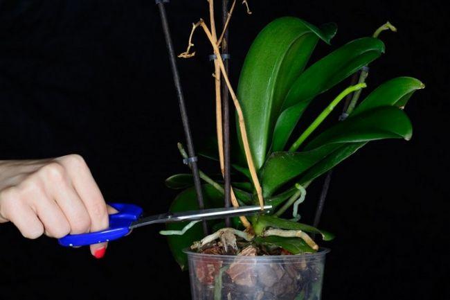 Воздушные корни орхидеи светло-серого цвета с зелеными кончиками. Их нельзя удалять, потому что они нужны растению для поглощения влаги и питательных веществ. Однако старые мертвые корни нужно удалить с помощью стерильного острого режущего инструмента.