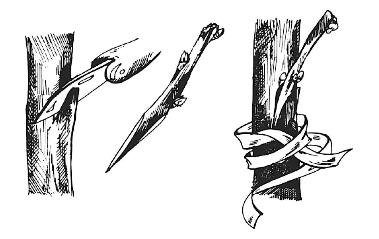 | Проведение прививки (улучшенная копулировка) | На подвое и привое делаются косые срезы одинаковой длины и угла. На срезах делаются «язычки» для лучшего сцепления. | Срезы должны быть ровными и гладкими. |