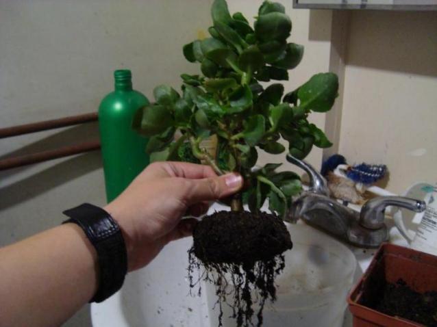 - Каланхоэ аккуратно извлекают из старого горшка вместе с земляным комом.