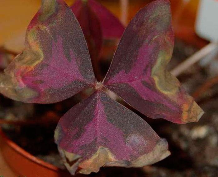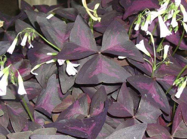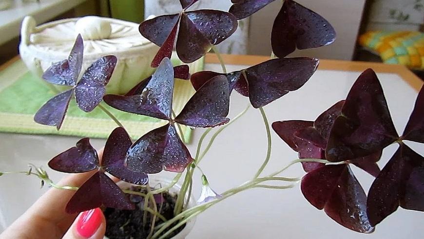 Теплолюбивые растения, подходящие для домашнего ухода, имеют крупные темно-пурпурные листья с более светлыми центральными участками. На каждом черешке располагаются три угловатые пластины. Небольшие светло-розовые цветы образуют рыхлые соцветия на длинных гибких цветоносах.