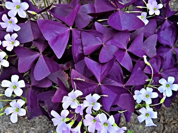 - Кислица фиолетовая — это самый распространенный сорт среди садоводов. Листья имеют треугольную форму и окрашены в яркий фиолетовый цвет с плавным переходом от темного к светлому оттенку.