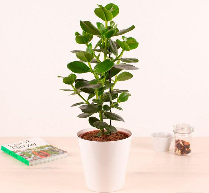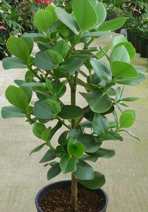 Это растение с разнополыми листьями относится к вечнозеленым видам. Оно может принимать форму небольшого дерева или кустарника, на ветвях которого располагается множество зеленых листьев. Листья имеют плотную и мясистую текстуру, а их поверхность покрыта восковым налетом. Форма листиков округлая, а цвет — темно-зеленый.