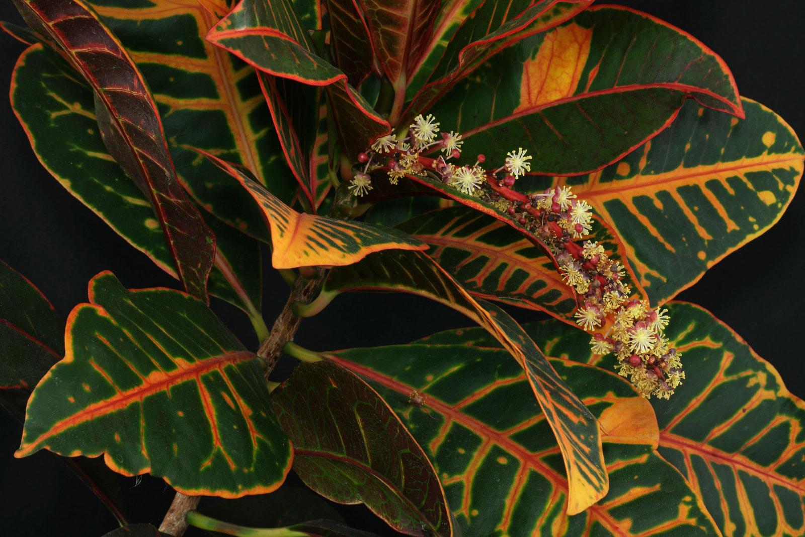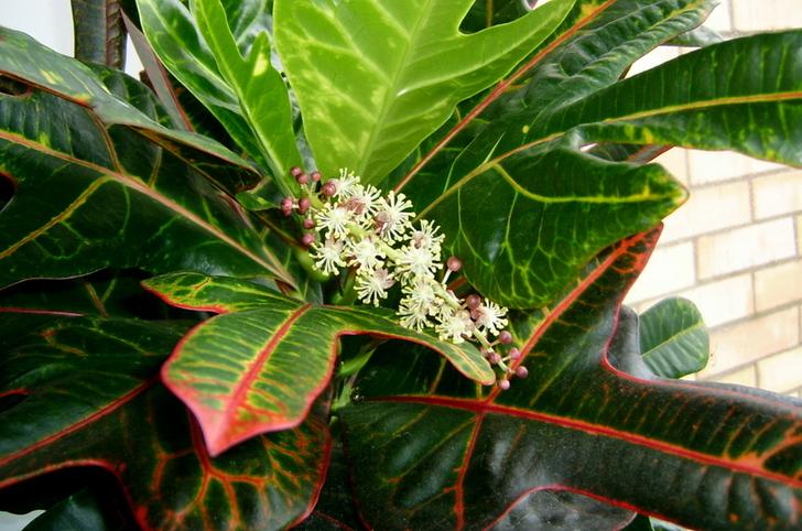 Цветонос кодиеума вырастает в пазухах листьев, на котором располагаются мелкие цветки бледных оттенков, собранные в соцветия. У некоторых сортов цветы настолько незаметны, что их цветение легко пропустить, особенно если на растении много ярких листьев.