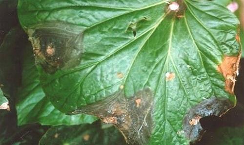 - серые пятна на листьях — серая гниль;