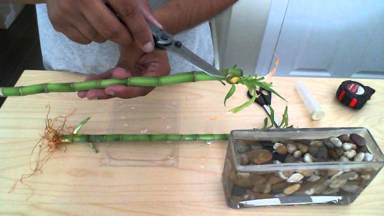Перед тем как поместить растение в выбранную емкость, стенки необходимо обработать кипятком. Затем аккуратно устанавливают бамбук, расправляя его корни. На дно контейнера следует положить камешки, а сам сосуд заполнить отстоянной водой.