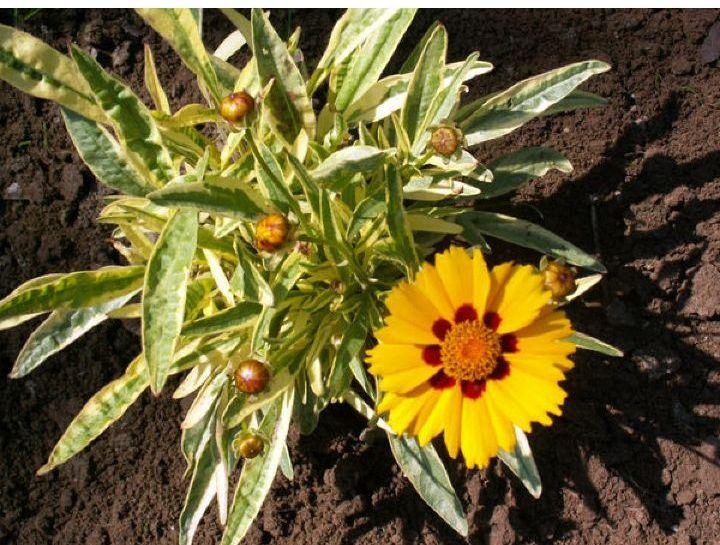 У пестролистных кореопсисов привлекательны не только их цветы, но и листья. Этот вариегатный сорт является производным от grandiflorum и отличается крупными цветками и пышной листвой.