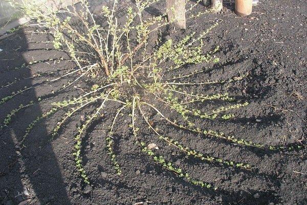 Для отводков выбирают однолетние побеги, которые находятся у основания куста, и берут их симметрично с разных сторон. Затем их помещают в заранее подготовленные борозды глубиной около 10 см. Важно, чтобы ветви побегов касались земли, включая основание, где они соединяются с кустом.