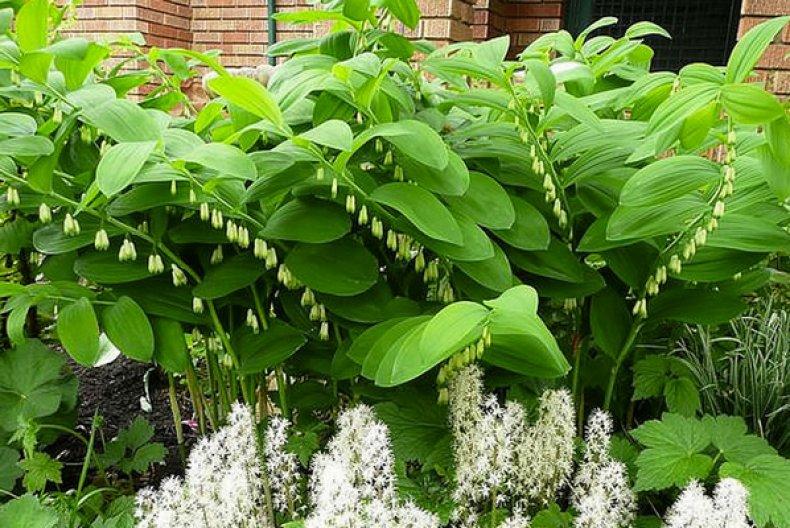 Купена многоцветковая будет отлично сочетаться не только с перечисленными цветами, но и с пестролистными растениями.