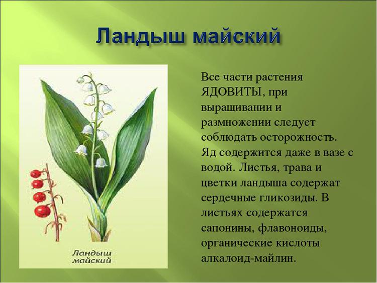 Однако, несмотря на свои полезные свойства, ландыш майский является ядовитым растением. Все его части содержат токсичные вещества, которые могут вызвать отравление при неправильном использовании. Симптомы отравления могут включать тошноту, рвоту, головокружение и даже сердечные аритмии. Поэтому важно соблюдать осторожность и консультироваться с врачом перед использованием препаратов на основе ландыша.